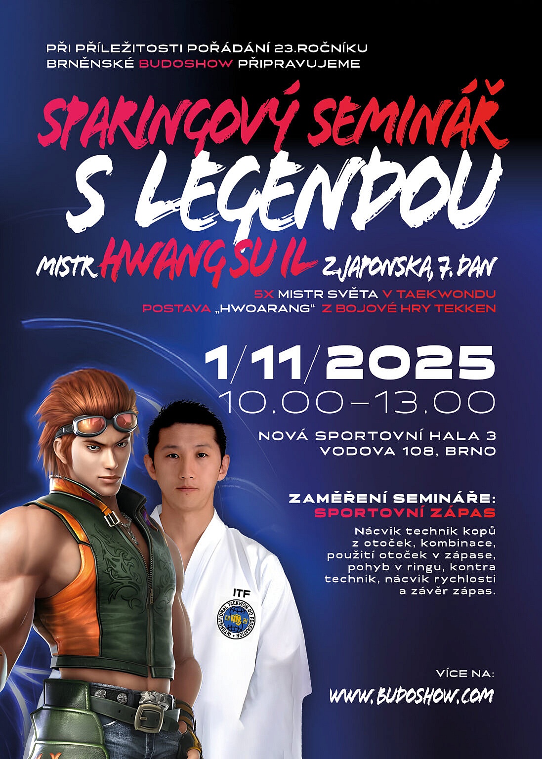 5x mistr světa v Taekwondo - postava "Hworang" z počítačové hry Tekken opět u nás. K příležitosti pořádání 23.ročníku Budoshow se uskuteční seminář zaměřený na sportovní zápas. Další informace na www.budoshow.com.